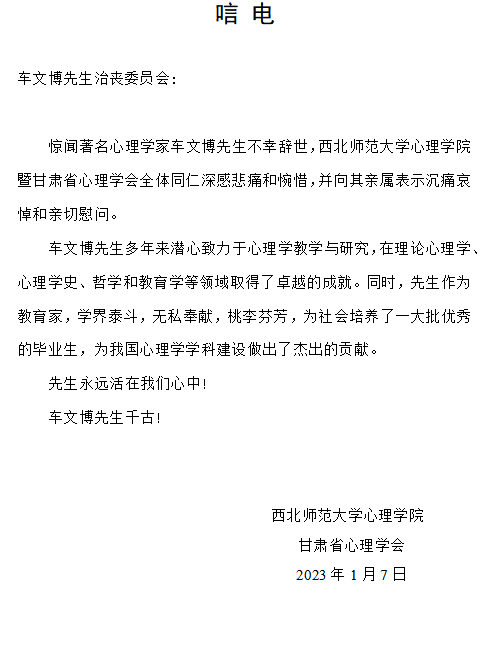 西北师范大学心理学院甘肃省心理学会唁电